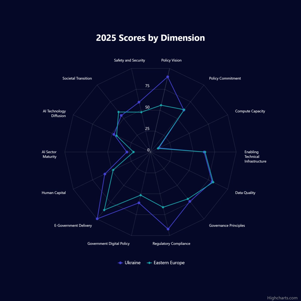 Government AI Readiness Index 2025 поставив Україну на 40 місце у світі, що є восьмим показником в регіоні.
